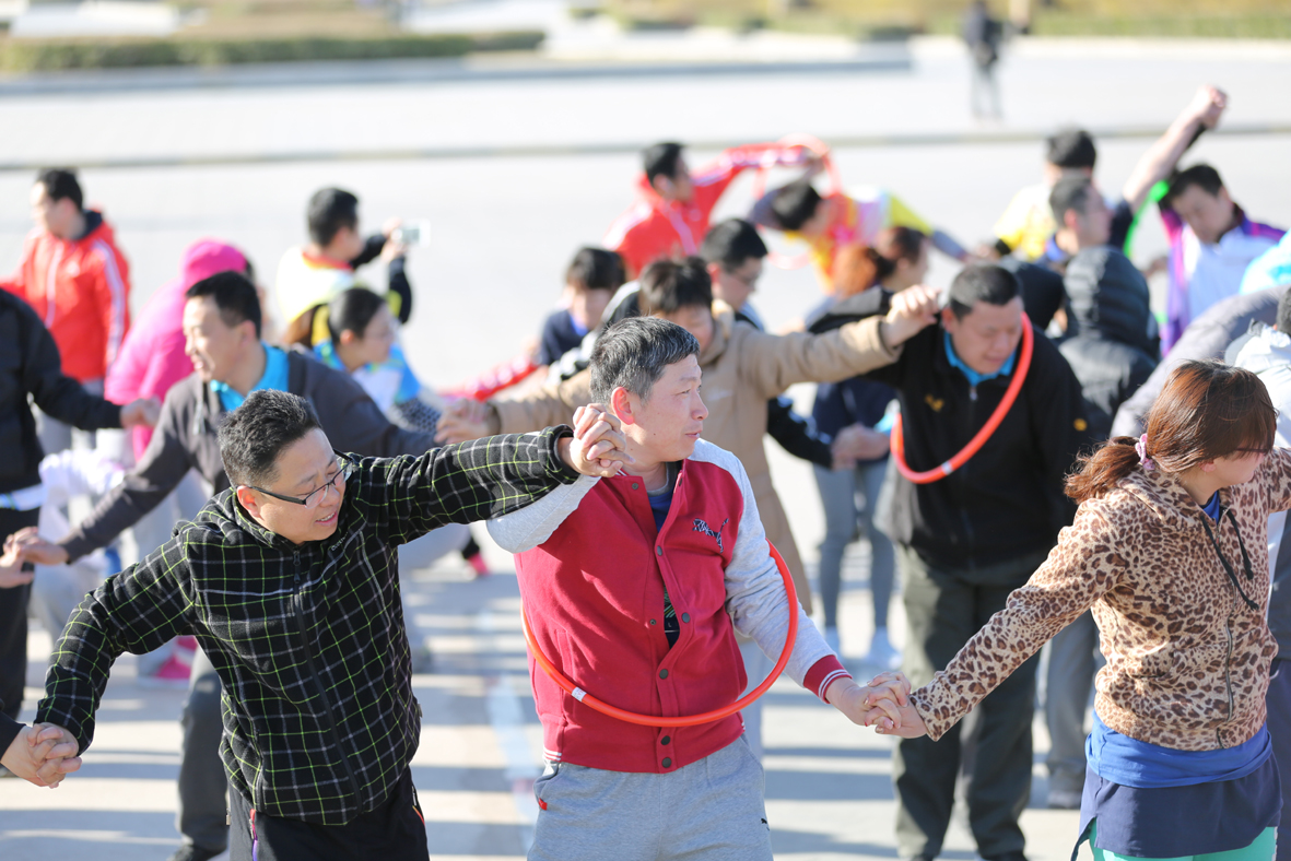 此次比賽全程6.6公里,過程中設計了障礙活動。第一圈開始前活動是“手拉手心連心”:隊員們站成一排,十指相扣手拉手,工作人員將十個呼啦圈逐一遞給第一名隊員,呼啦圈從頭部套入、腳下穿過,依次向下傳遞至最后一名隊員,任務完成,比賽繼續(xù)。第二圈開始前活動是踢毽子,毽子不落地且每個隊員都觸毽子一次。